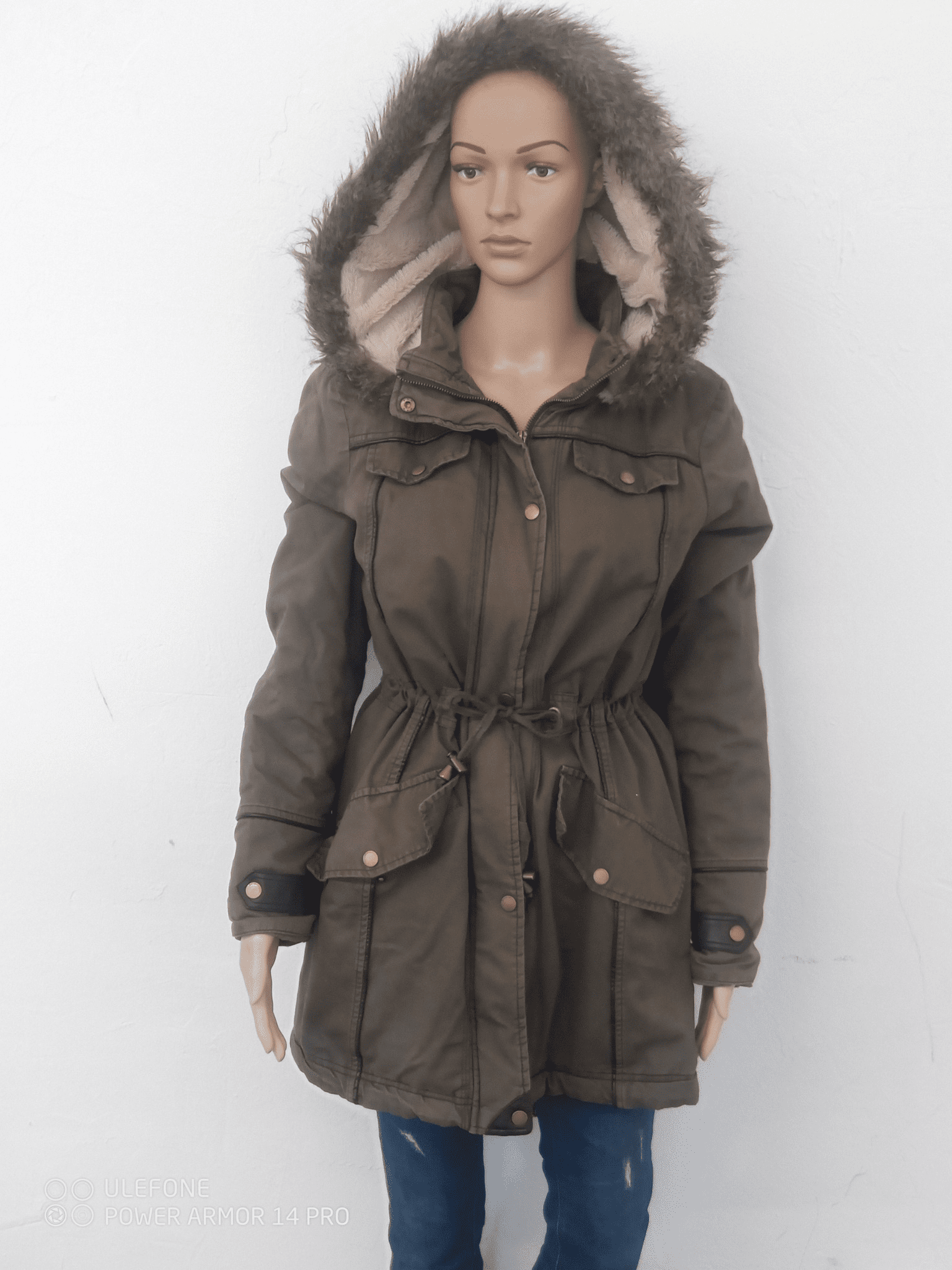 Brave Soul ženska zimska jakna s kapuco – velikost XL Topla olivno-zelena bunda z umetnim krznom na kapuci in vrvico v pasu za lepšo obliko postave. ✔ Znamka: Brave Soul ✔ Velikost: XL ✔ Notranja podloga iz umetnega krzna za dodatno toplino ✔ Sprednji žepi s poklopci in gumbi ✔ Kapuca z robom iz umetnega krzna ✔ Odlična izbira za vsakodnevno nošenje v hladnih dneh ❄️🍂