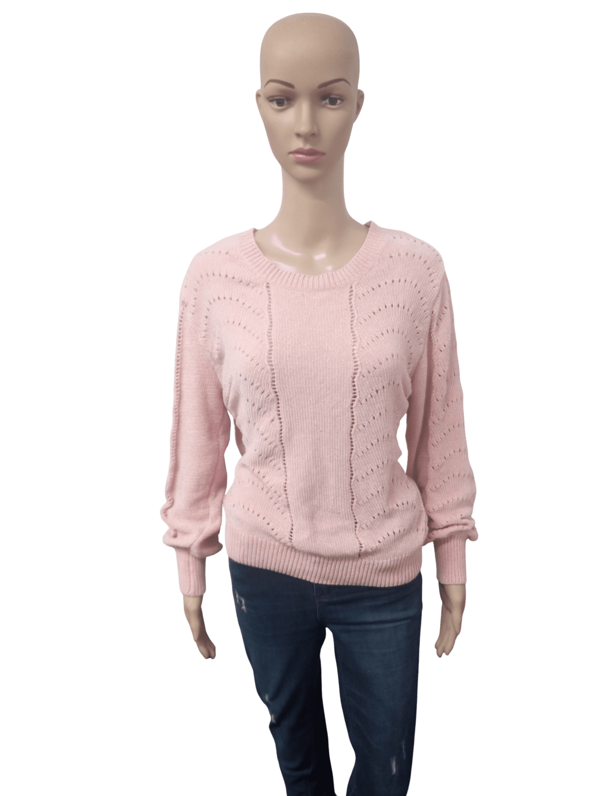 Lep, nežen pulover znamke KappAhl v svetlo roza barvi, velikost S, narejen iz mehke pletenine z dekorativnim vzorcem. Klasičen kroj z rahlo spuščenimi rameni in rebrastimi robovi je idealen za vsakodnevno nošenje ali slojevito kombiniranje v hladnejših mesecih.