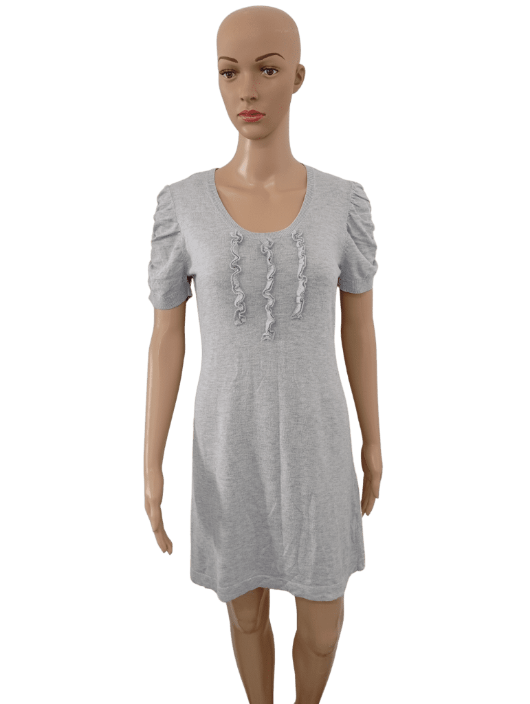 Čudovita siva obleka znamke ESPRIT je popolna izbira za sproščen, a ženstven videz. Izdelana je iz mehkega bombaža, kar zagotavlja izjemno udobje pri nošenju. Kroj lepo pade in se prilega postavi, kratki rokavi z nabranim detajlom pa dodajo ščepec romantičnosti. Spredaj so trije okrasni volančki, ki obleki dodajo poseben značaj. Velikost S, primerna za vsakodnevno nošenje ali sproščene priložnosti.