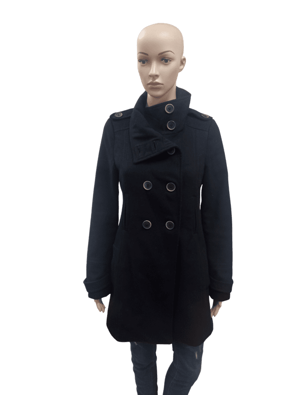 Eleganten črn plašč ZARA (L) z dvojnim zapenjanjem in visokim ovratnikom. Kroj je moden, topel in idealen za hladnejše dni. Kakovosten material lepo drži obliko in zagotavlja udoben, šik videz.